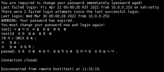 3.2.4. -I : 유예기간 (5일로 설정했다면 패스워드 최대 사용일이 지난 후 5일 동안은 login시 패스워드 변경하면 사용 가능함을 알리는 메시지 출력 및 패스워드 변경가능)