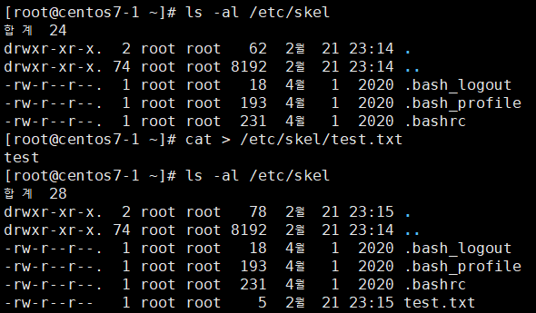 5.6 비어 있는 /etc/skel 디렉토리에 test.txt. 생성