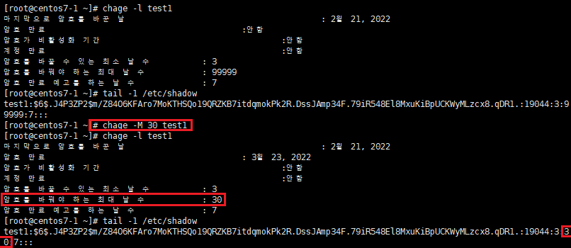 4.11. chage -M 명령어로 패스워드 최대 사용일을 설정하고 변경 값 확인