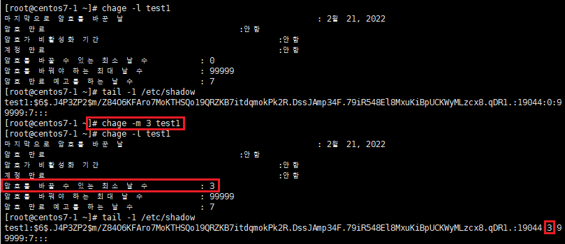 4.4. chage -m 옵션으로 패스워드 최소 사용기간 변경 후 결과 값 확인