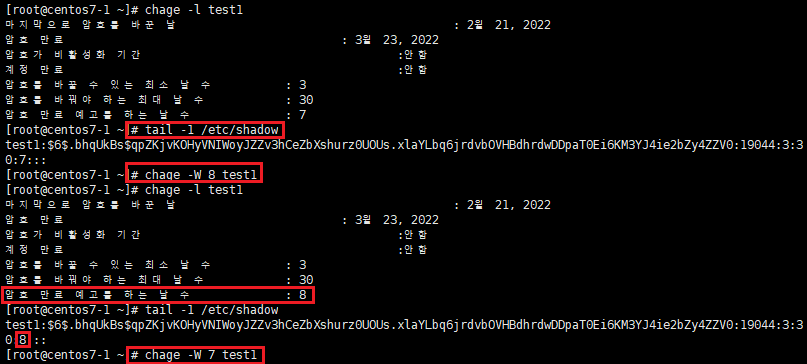 4.12. chage -W 명령어로 만료 경고일 수 변경 후 확인 (실습에서 설정할 값이 7일이기 때문에 확인 후 다시 7일로 설정)
