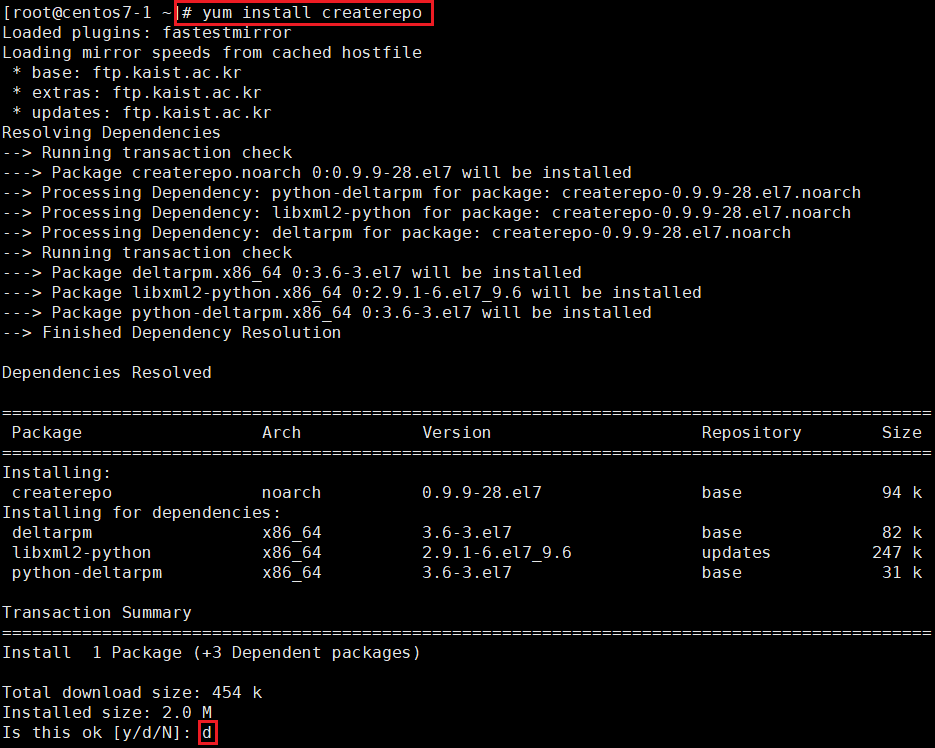 3.1.1. # yum install 명령어를 통해 createrepo 패키지를 설치할 때 옵션을 선택할 수 있습니다. 우선 n 옵션으로 설치를 취소합니다. (y : 다운로드 후 설치, d : 패키지 파일을 다운로드만 함, N : 설치하지 않음)