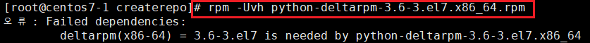 3.2.2. #rpm -Uvh 명령어로 createrepo 패키지를 설치하려고 하면 의존성 문제로 오류가 발생하는 것을 확인합니다.