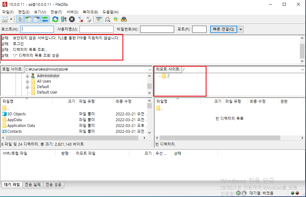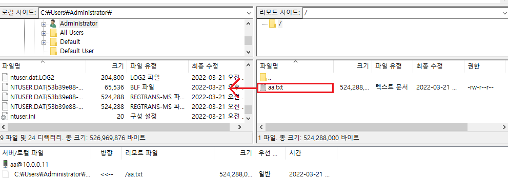 3.2.7. FileZilla를 통해 FTP 서버에서 aa.txt 파일을 다운로드합니다.