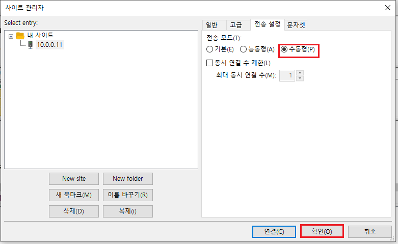 3.2.5. FileZilla의 전송 설정을 수동형으로 변경합니다.