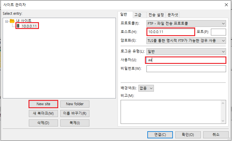 3.1.11. New site를 통해 연결할 서버 생성 후 IP Address, 사용자를 입력합니다.