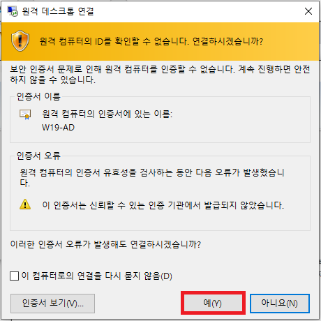 3.6. 인증서 문제가 발생 시 예(Y)를 누릅니다.