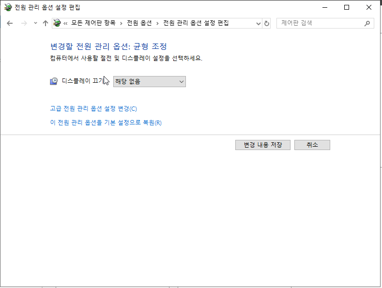 2.2.7. 디스플레이 끄기를 해당 없음으로 설정하고 변경 내용을 저장합니다.