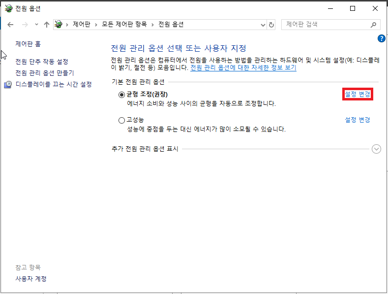 2.2.6. 제어판의 전원 옵션으로 들어가 설정 변경을 눌러줍니다.