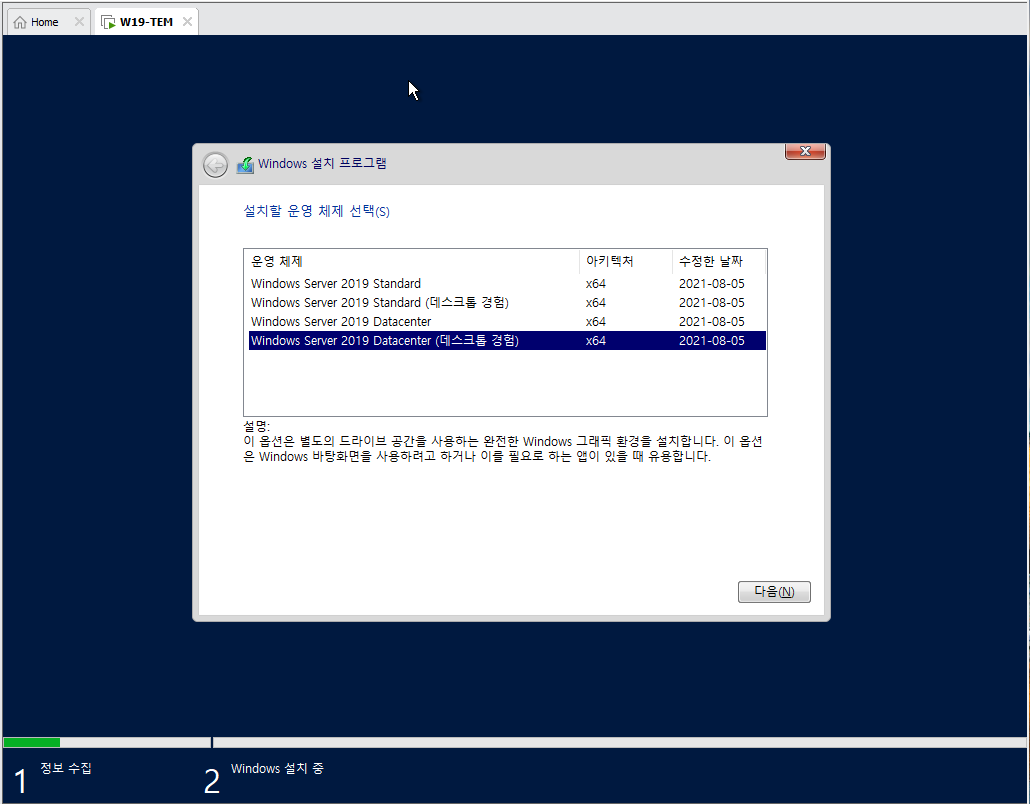 1.5. Windows Server 2019 Datacenter (데스크톱 경험) 버전으로 설치합니다. (Windows는 GUI 환경이기 때문에)