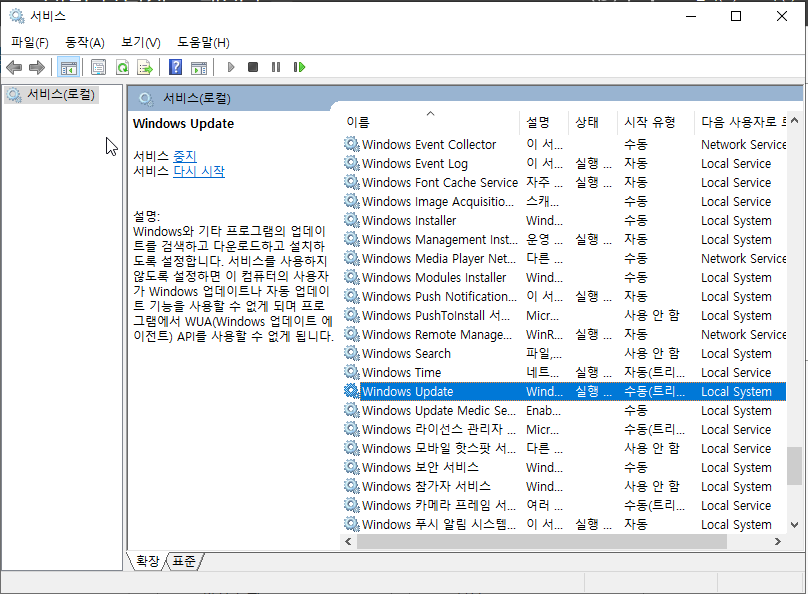2.1.2. 서비스 관리자에서 Widnows Update를 더블클릭합니다.