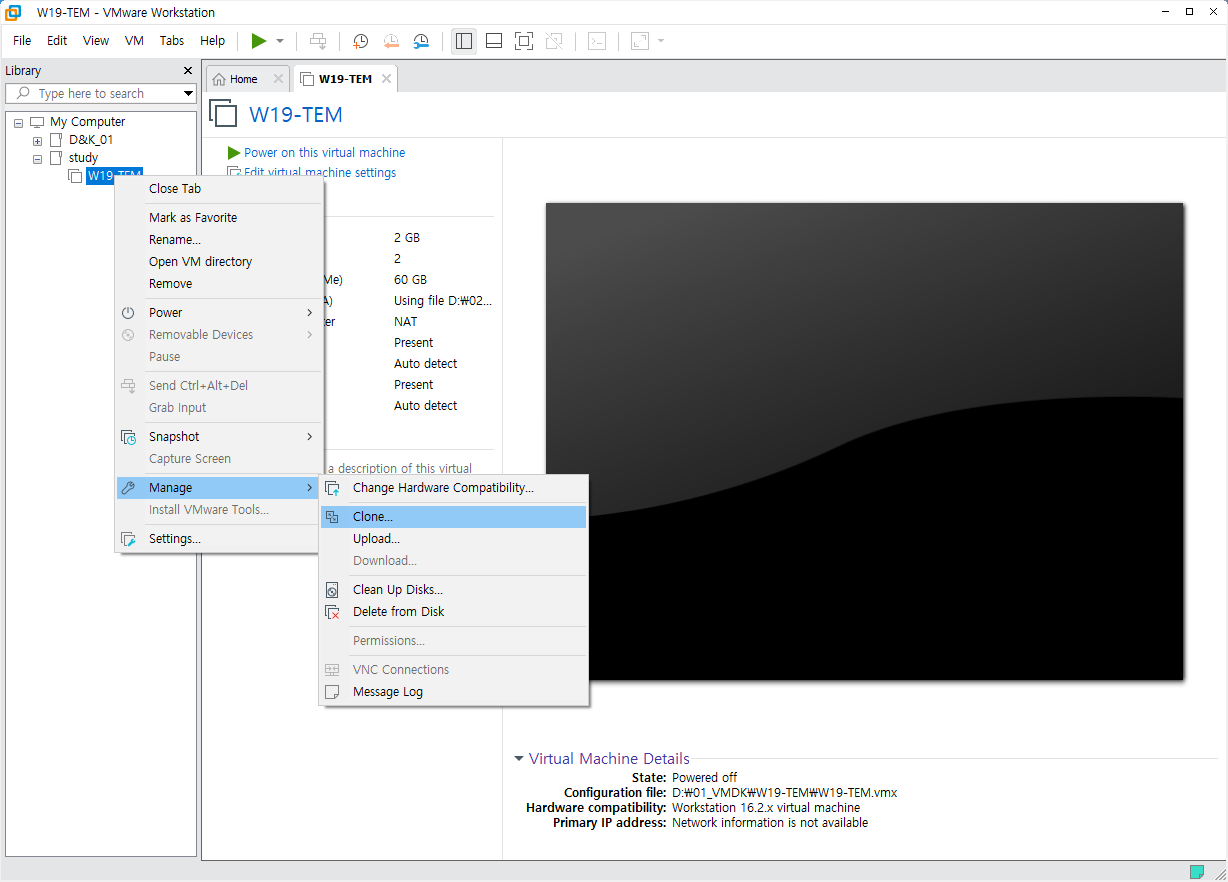2.7.1. 새로 만들어진 Virtual Machine을 우클릭하고 Manage - Clone을 누릅니다.